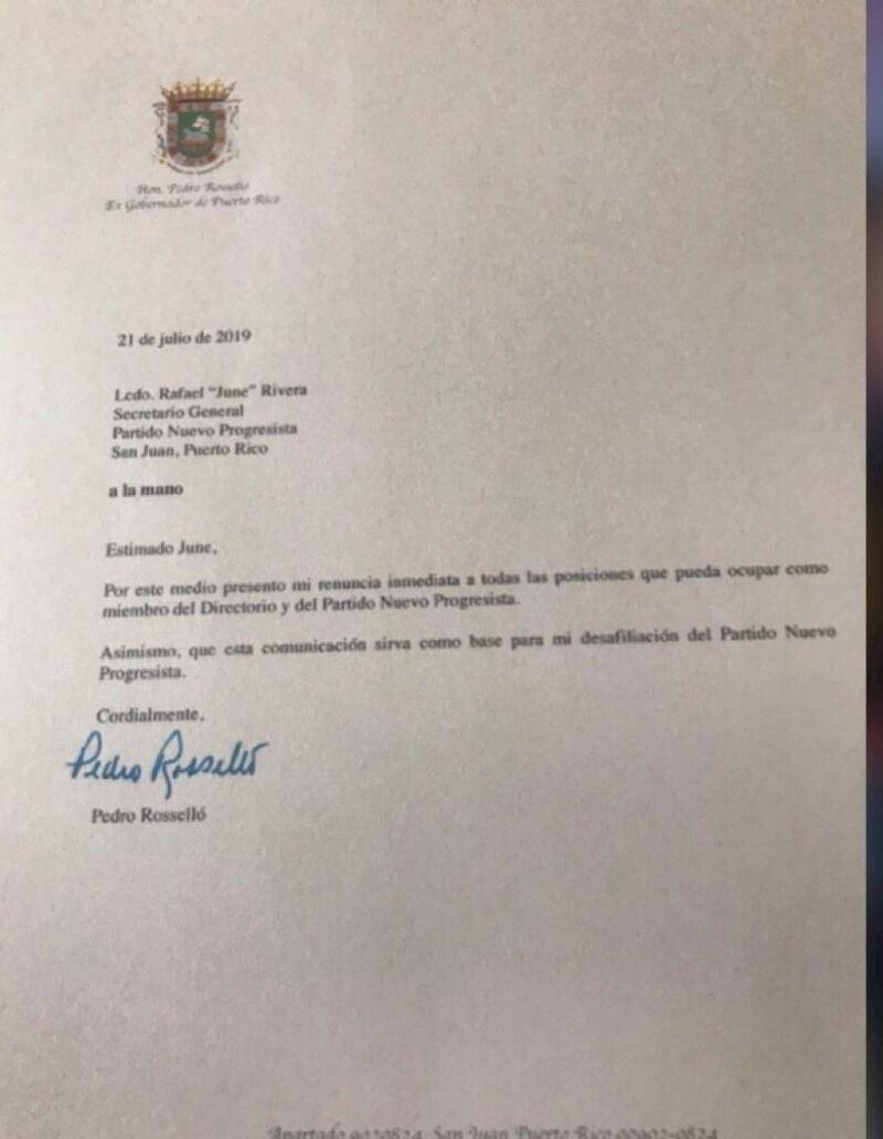 Con una carta de solo dos oraciones, el exgobernador, Pedro Rosselló notifica su desafiliación al partido que una vez presidió. La misiva está dirigida al representante June Rivera, quien ayer también re nunció a la secrtaría general del PNP. La carta fue revelada esta noche por la periodista Milly Méndez. Imágenes que corren por las redes sociales indican que Pedro Rosselló salió de Puerto Rico en el fin de semana. También habría renunciado a la Comisión de la Igualdad que designó su hijo para gestionar la estadidad para Puerto Rico.