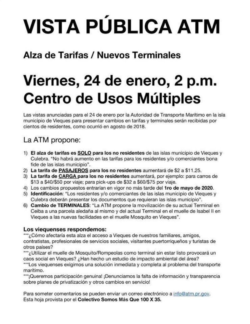 La ATM realizó vistas hoy, viernes 24 de enero, para dilucidar con los viequenses las nuevas tarifas que quieren imponer. Como todos sabemos, el servicio de la ATM a las islas municipios son un desastre, al borde del bochorno.