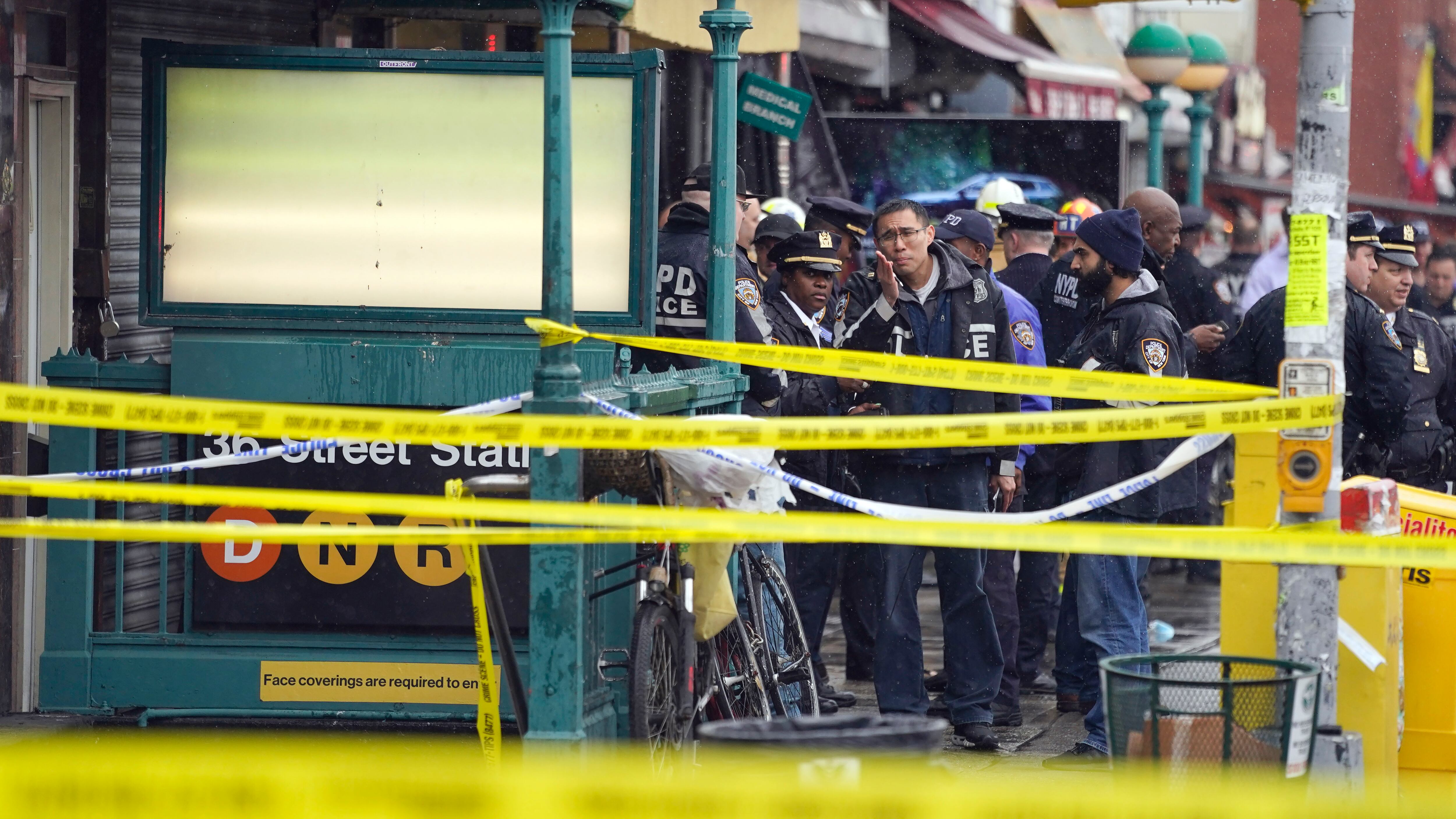 Miembros de la policía de la ciudad de Nueva York, junto a la entrada de una parada de metro en Brooklyn, Nueva York, el 12 de abril de 2022. (AP Foto/John Minchillo) (John Minchillo/AP)