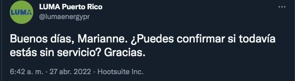 En Twitter (red social que se conoce porque la gente hace mucho lloriparty), LUMA publicó “Buenos días, Marianne. ¿Puedes confirmar si todavía estás sin servicio? Gracias.” El punto es que no taguiaron a Marianne, ni fue un mensaje directo. (Esperamos que le llegue el mensaje)