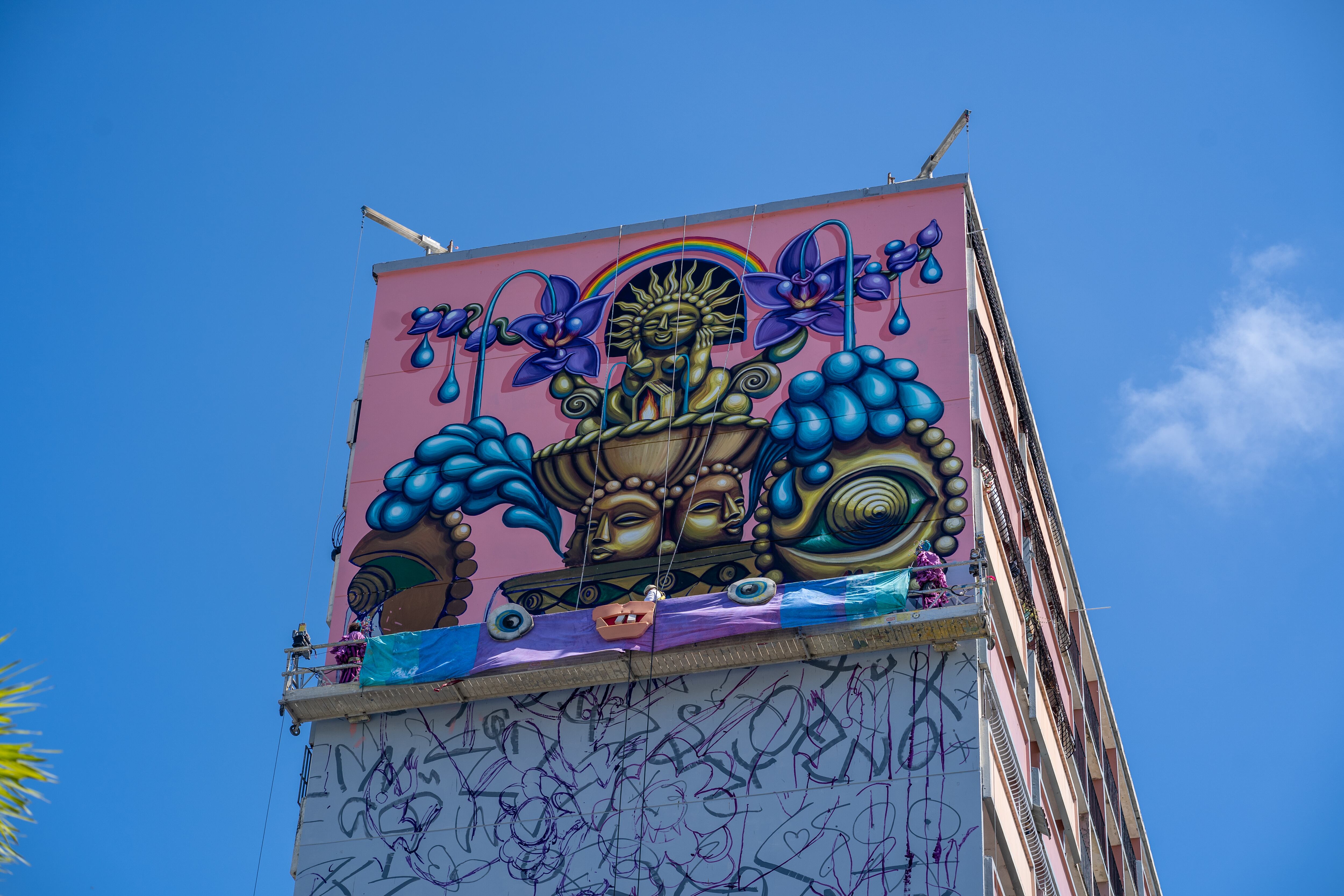 Por ejemplo, el primer mural que se creó fue inspirado en la canción “Como Agua”. El gigantesco mural, que estuvo a cargo de la artista canadiense Danae Brissonnet --reconocida internacionalmente por sus murales, máscaras, ilustraciones y títeres-- ubica en el edificio Bahía A en la comunidad de El Gandúl en Santurce. Se escogió esta pared como punto de partida por su imponente presencia, pero también por su nombre y lo que simboliza. Brissonnet creó una imagen fantástica de una sirena que sirve como fuente de la juventud, con imágenes color rosado, que representan la fauna y la flora que se encuentran en Santurce y en Bahía. Previo a la creación del mural, la artista convocó a la comunidad del edificio para conocer sus opiniones y que formaran parte de la imaginería del mural, promoviendo así una colaboración no solo entre dos artistas, sino con la comunidad de Bahía.