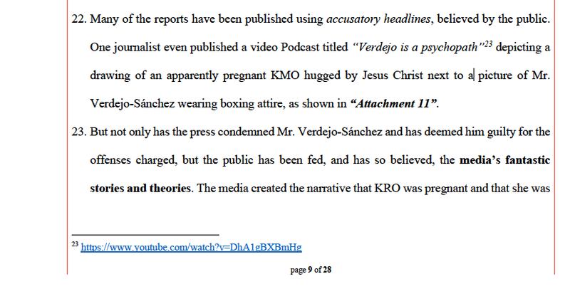 En el documento se recopilan varias publicaciones de la prensa sobre el caso donde se hace referencia a Verdejo para asegurar que sería complicado encontrar un jurado imparcial para el juicio debido a la exposición mediática del suceso.