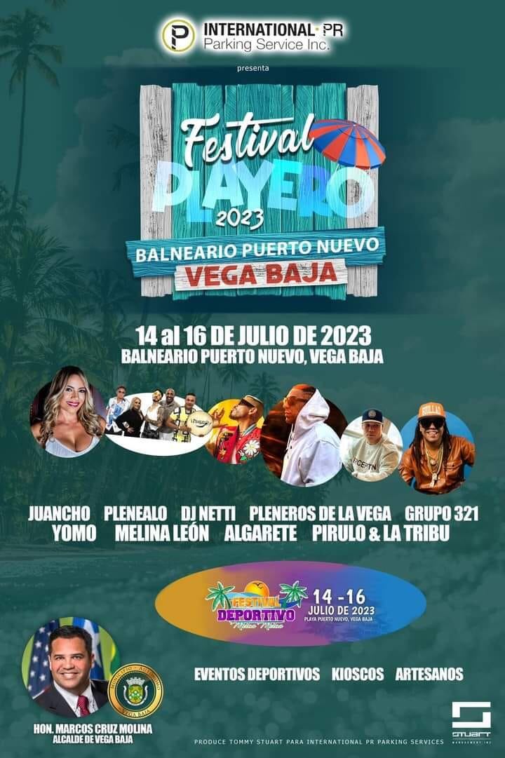 El municipio de Vega Baja y su alcalde Marcos Cruz Molina anunciaron la celebración de su tradicional Festival Playero, del 14 al 16 de julio de 2023, en el Balneario Puerto Nuevo en Vega Baja.