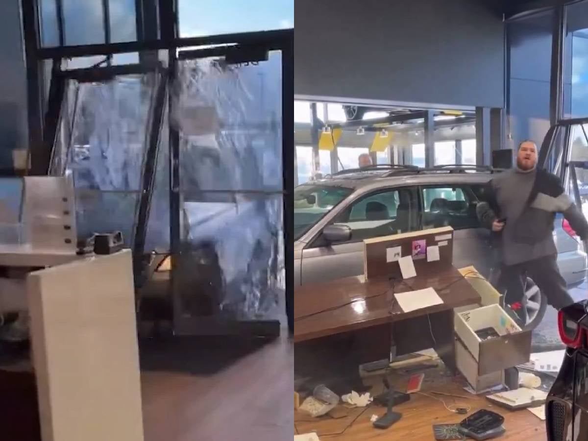 Pocas horas después, a las 4 p.m. locales, llevó a cabo su amenaza y condujo el automóvil hasta el concesionario, impactándolo contra la entrada principal, destrozando las puertas de vidrio y causando pánico entre empleados y clientes.