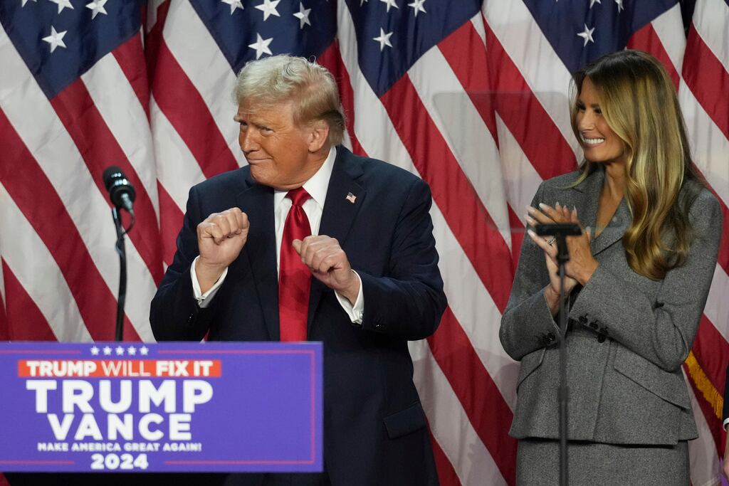 Donald Trump baila en el escenario junto a Melania Trump al festejar su triunfo electoral en el Beach County Convention Center de Palm Beach, la madrugada del 6 de noviembre. (Lynne Sladky/AP)