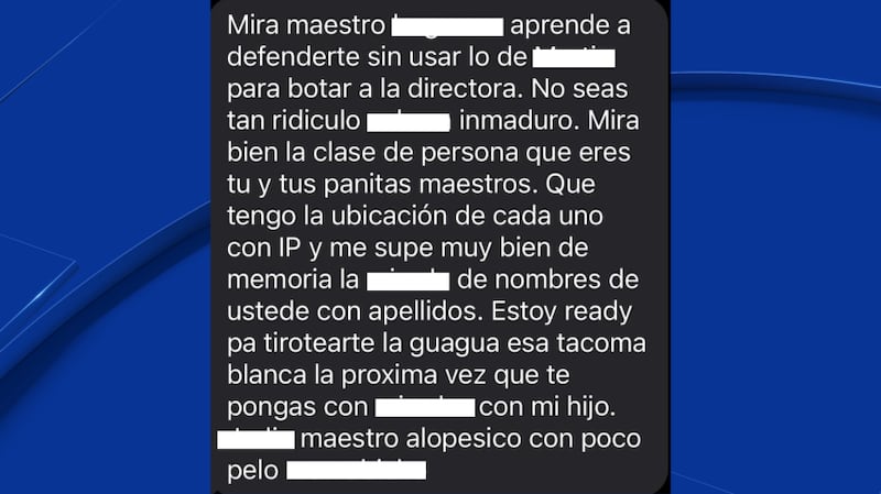 “Mira maestro buga***, aprende a defenderte sin usar lo de Martín para botar a la directora. No seas tan ridí... ca*** inmaduro. Mira bien la clase de persona que eres tú y tus panitas maestros. Tengo la ubicación de cada uno con IP y me supe muy bien de memoria la mie*** de nombres de ustedes con apellidos. Estoy ‘ready’ pa tirotearte la guagua la próxima vez que te pongas con mier*** con mi hijo”, leen las fuertes declaraciones.