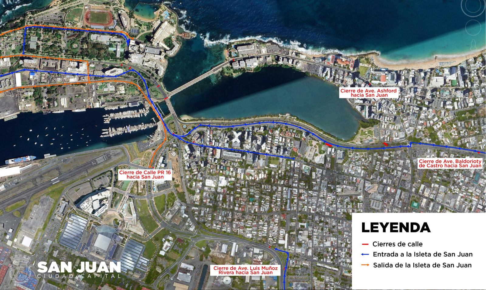 Las siguientes vías estarán cerradas al tránsito que intenta entrar a la isleta de San Juan:
