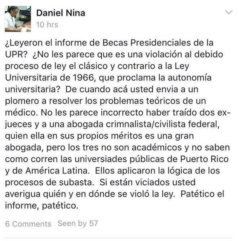 Nina fue más allá y en un foro de Abogados en Puerto Rico en la red social de Facebook arremetió contra la violación del debido proceso de ley y otros derechos, aduciendo que los investigadores los violentaron durante la investigación.