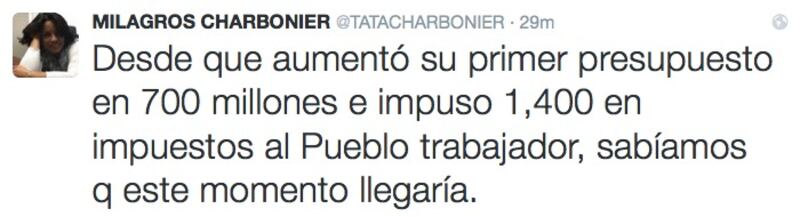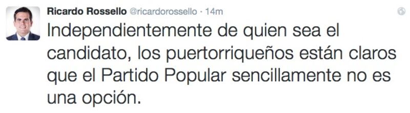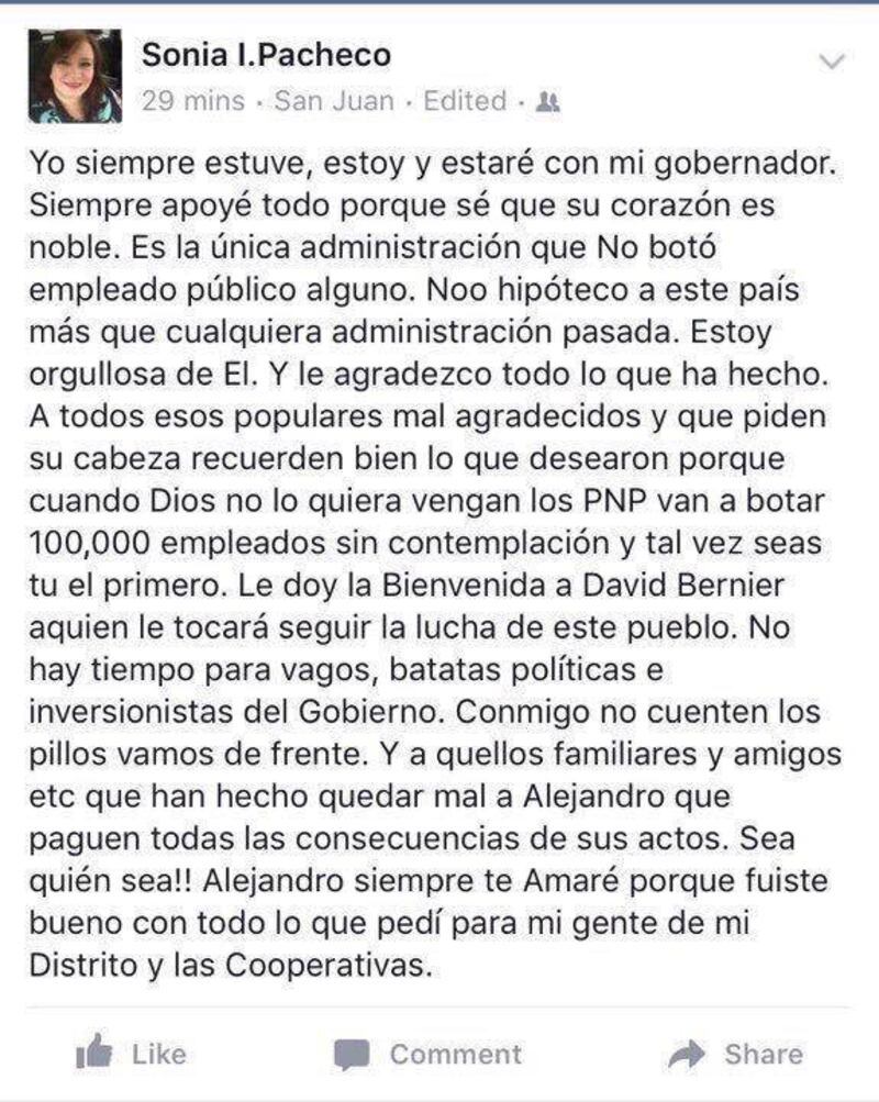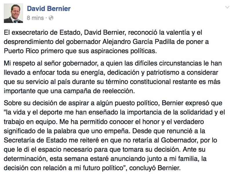 “El futuro político es una decisión muy personal que debe respetarse y en ese sentido no puedo aprobar o rechazar la decisión del gobernador. Han sido tiempos duros que requieren de una madurez y experiencia que no se ha podido demostrar durante su mandato. La realidad es que desde ese 'me vale’, luego el anuncio de una reducción al Impuesto de Ventas y Uso que terminó siendo un aumento, la amenaza con el cierre de la Autoridad de Carreteras si no se aprobaba la crudita, el Retiro de maestros, la falta de pago de los reintegros y del bono de Navidad, entre otras decisiones, ha llevado a la desconfianza con esta administración y a la incertidumbre del pueblo… Podrán cambiar el piloto, pero el avión que es el Estado Libre Asociado (ELA) simplemente no da para más. Es precisamente nuestra situación colonial el mayor obstáculo que tenemos para afrontar y salir de la crisis que vivimos. Ese avión del ELA se quedó sin combustible, es tiempo de tomar una dirección ya sea a la derecha o a la izquierda y es mediante la estadidad que podremos obtener la igualdad que merecemos y nos corresponde como ciudadanos americanos”.
