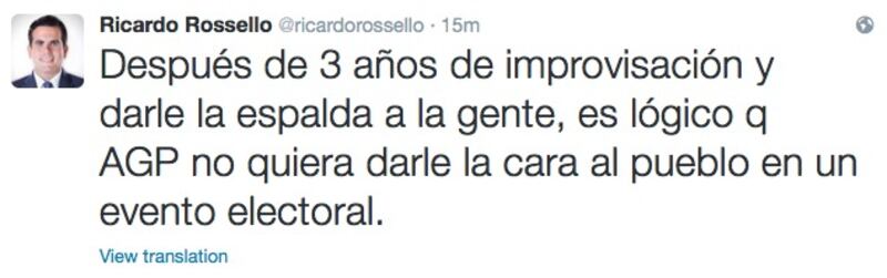 “La agenda de trabajo para alcanzar la recuperación de Puerto Rico no ha sido fácil. Reconozco el trabajo, la dedicación y la responsabilidad del gobernador Alejandro García Padilla, aun cuando en algunas ocasiones no he estado de acuerdo con sus posturas. Respeto su determinación de poner primero su función como gobernador y cumplir a cabalidad el mandato que el pueblo le dio. Estoy disponible para continuar la agenda de trabajo para levantar a Puerto Rico de una crisis económica heredada. Este es un asunto en el cual tenemos que sumar voluntades y caminar juntos por nuestra patria”.