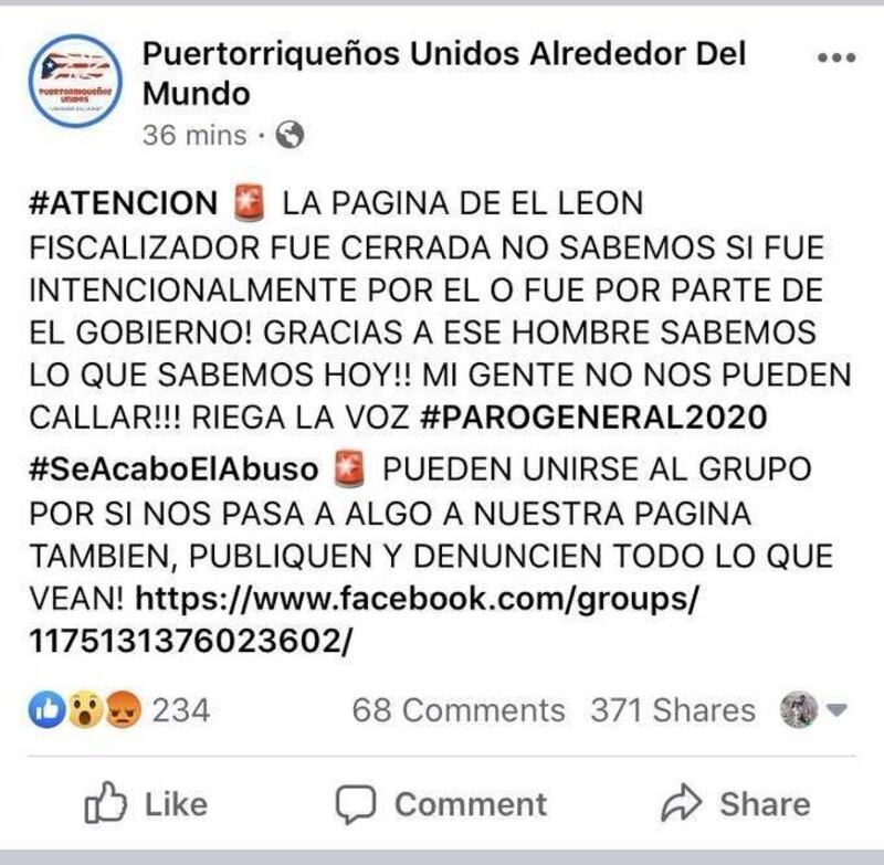 La gente anda denunciando que la página de Facebook de Lorenzo Delgado Torres, alias el León Fiscalizador de Ponce, ha sido borrada o bloqueada de la plataforma digital. Esto se da luego de que Torres se convirtiera en un héroe nacional al destapar que en un almacén de la Perla del Sur se escondían suministros desde el paso del huracán María.