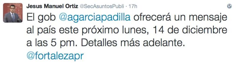 “El gobernador Alejandro García Padilla ofrecerá un mensaje al país este próximo lunes, 14 de diciembre a las 5 p.m.”, escribió Jesús Manuel Ortiz, secretario de Asuntos Públicos de La Fortaleza, en su cuenta de Twitter.