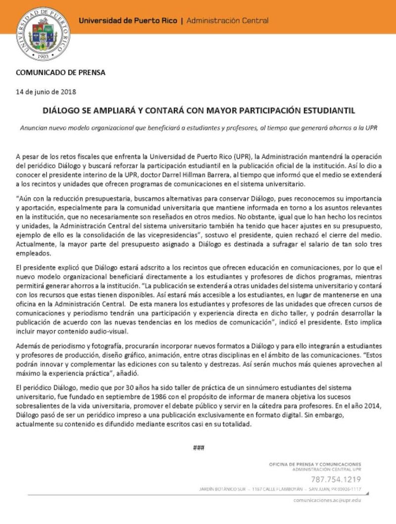 En un comunicado de prensa que el equipo de Diálogo emitió en la tarde de el jueves, indicaron que se oponen a esto a nuevo modelo organizacional impulsado por Presidencia y rechazó que, sin consulta previa, la administración universitaria busque tapar el recorte del medio con una nueva estructura operacional.