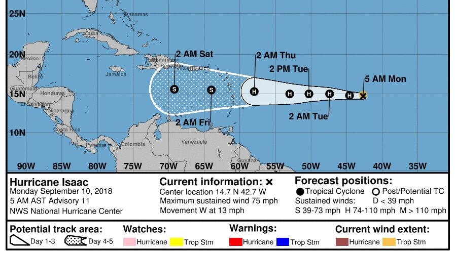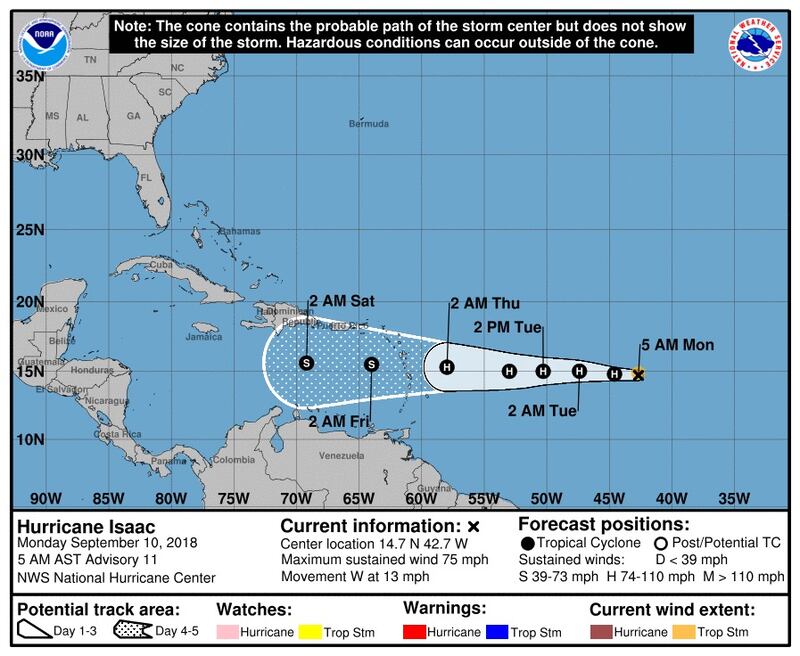 En el boletín de las 11:00 de la noche del domingo, el sistema fue catalogado como el quinto huracán de la temporada de 2018. A las 5:00 de la madrugada del lunes, Isaac está localizado en la latitud 14.7 grados norte, longitud 42.7 oeste. Sus vientos máximos sostenidos son de 75 millas por hora y se mueve al oeste a 13 millas por hora.