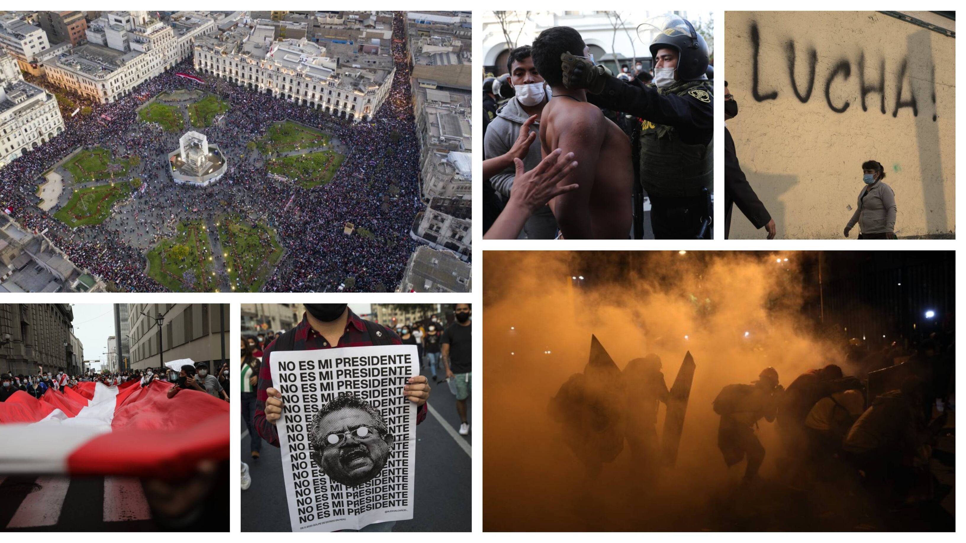 Las protestas contra Merino empezaron el lunes y el sábado se llevaron a cabo en las principales ciudades de los Andes y la Amazonía. En Lima más de 5,000 manifestantes con mascarillas y protectores faciales llevaban carteles que decían “Merino no es mi presidente”, entre otras frases.