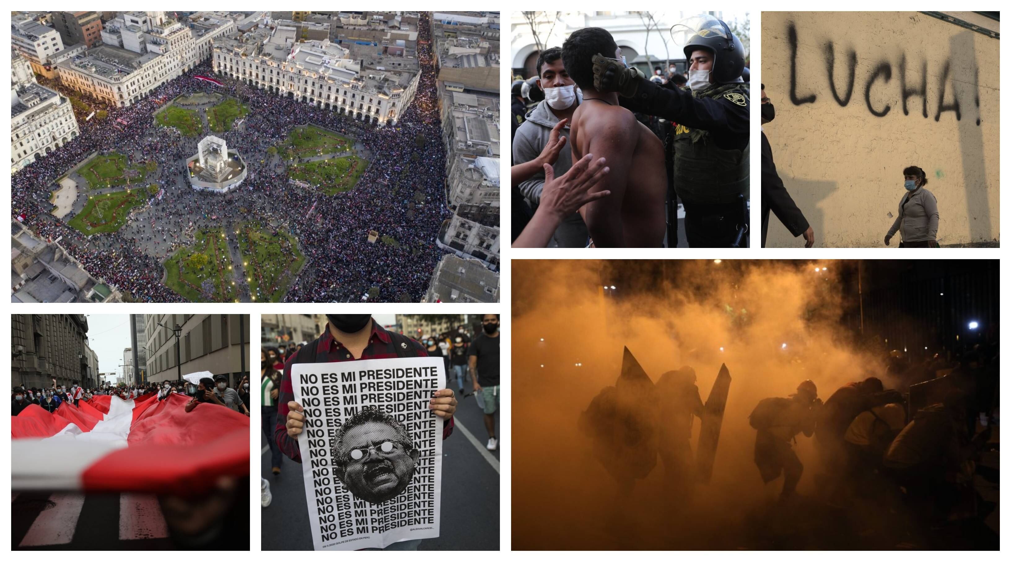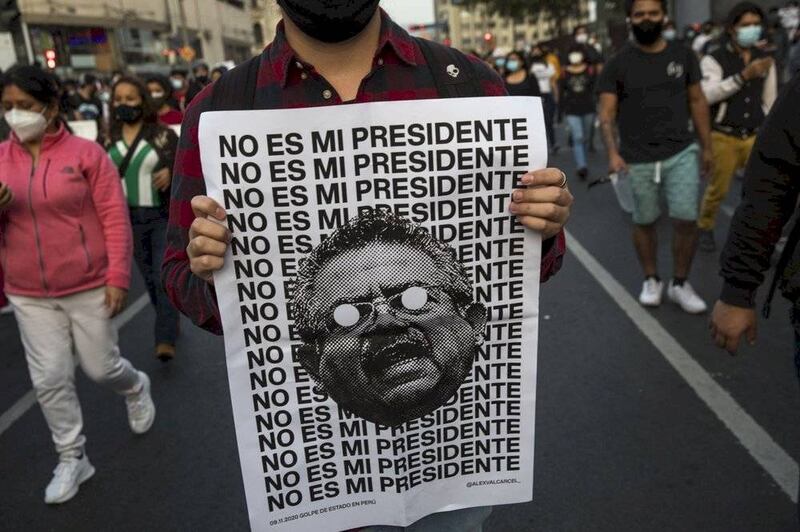 Las protestas contra Merino empezaron el lunes y el sábado se llevaron a cabo en las principales ciudades de los Andes y la Amazonía. En Lima más de 5,000 manifestantes con mascarillas y protectores faciales llevaban carteles que decían “Merino no es mi presidente”, entre otras frases.