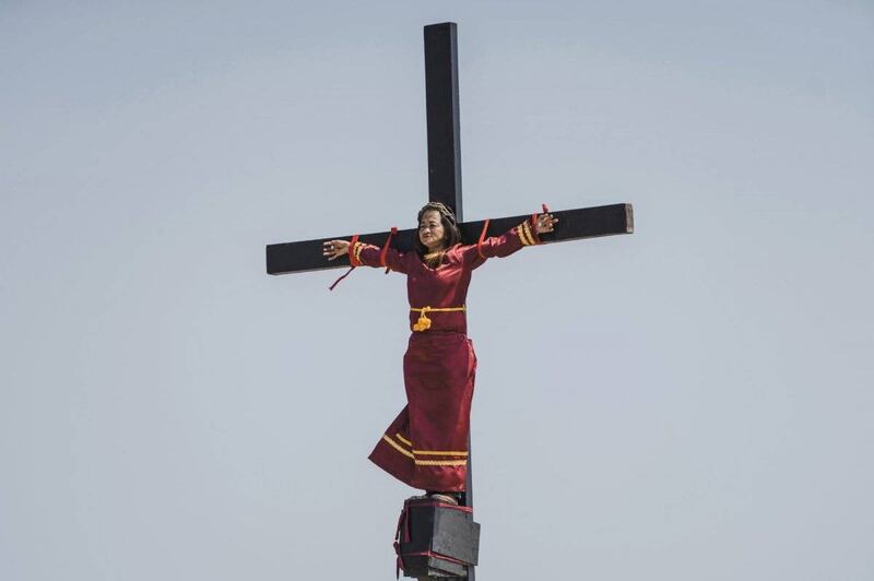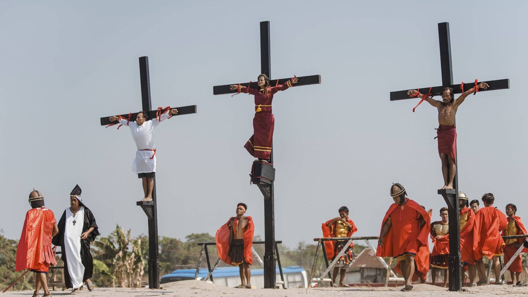 Cuatro hombres y una mujer, algunos de ellos con coronas de espinas, fueron escoltados por aldeanos vestidos como centuriones romanos antes de ser crucificados en las cruces colocadas sobre una polvorienta colina del pueblo San Pedro Cutud.