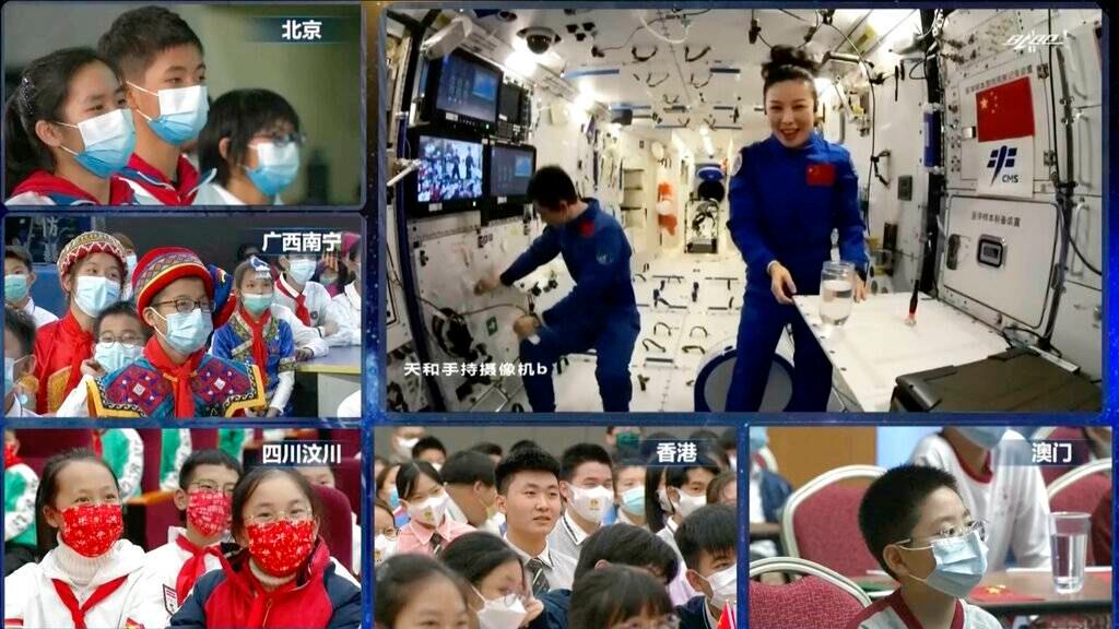 Estudiantes de Beijing, la región semiautónoma de Hong Kong y otras tres ciudades ametrallaron a los astronautas con preguntas sobre la vida en el espacio y recibieron un tour virtual de la estación. El evento también fue emitido en vivo para el público.