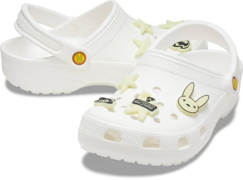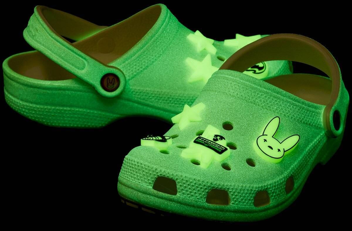 El conejo malo se unió a Crocs para lanzar una línea de zapatos para mujeres, hombres y niños que brilla en la oscuridad, así como decoraciones con dijes brillantes Jibbitz™ inspirados en Bad Bunny.