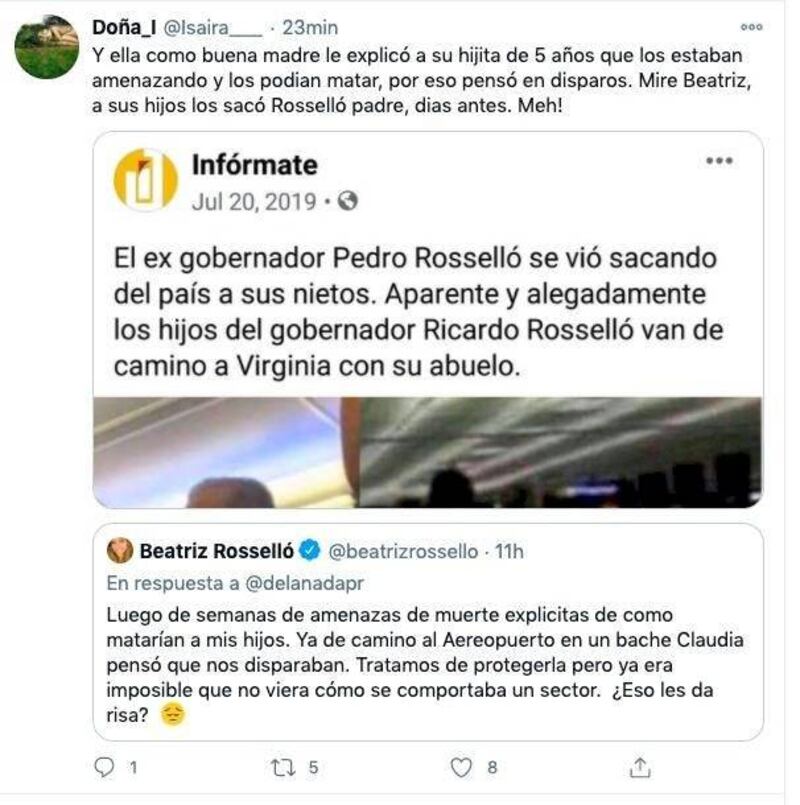 Beatriz Rosselló, quien fuese la Primera Dama durante casi el 75% del pasado cuatrienio, reapareció en Twitter a responderle a la cuenta de caricaturas de De La Nada!, siguiendo el discurso que estableció su esposo en la entrevista que le diera al New York Times.