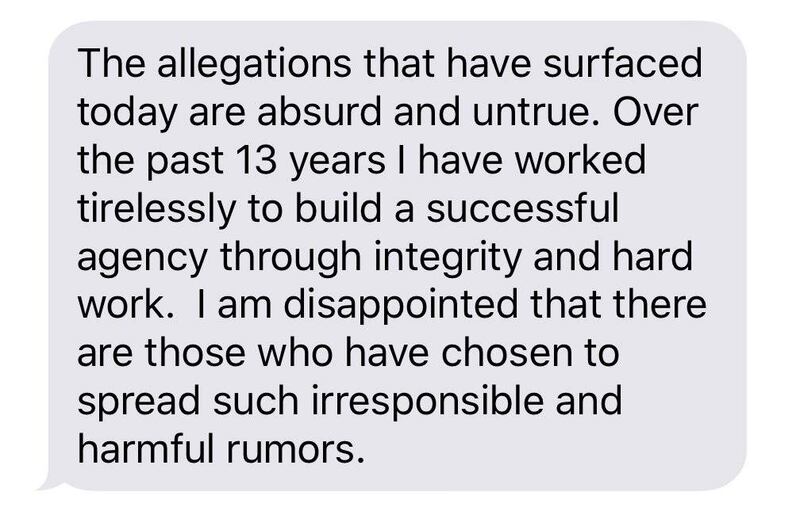 “Durante los pasados 13 años, he trabajado fuerte para construir una agencia exitosa a través de la integridad y el trabajo duro”, dijo Wood en declaraciones escritas. “Estoy decepcionado que hay gente que ha decidido regar estos irresponsables y dañinos rumores”.