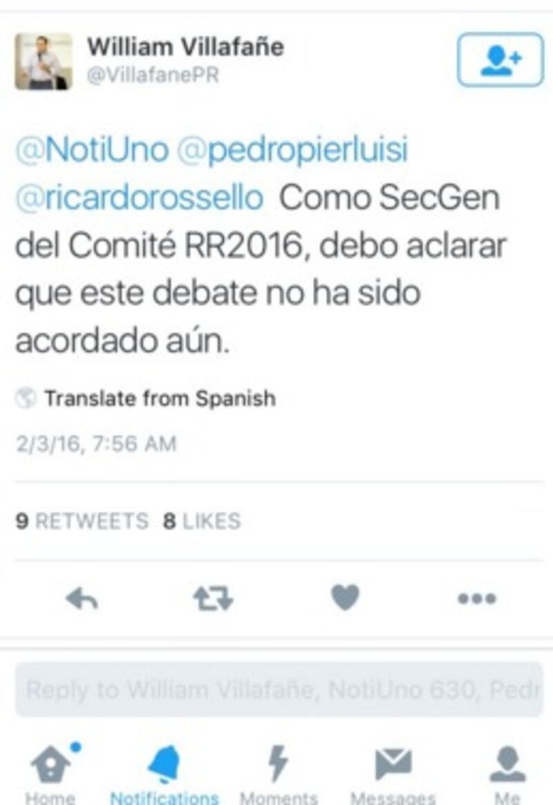 “El 30 de diciembre, fecha en que culminaba el proceso de radicaciones, y siendo Pierluisi y Rosselló los únicos dos candidatos que radicaron, enviamos el 7 de enero de 2016 tres cartas a Sánchez, entre la que se encontraba una de invitación a él, o cualquier representante de la campaña, para la primera reunión el 13 de enero de 2016 en la que se acordarían los términos de dos debates, uno el 24 de febrero próximo y otro el 31 de mayo de 2016”, explicó Delgado en la misiva.