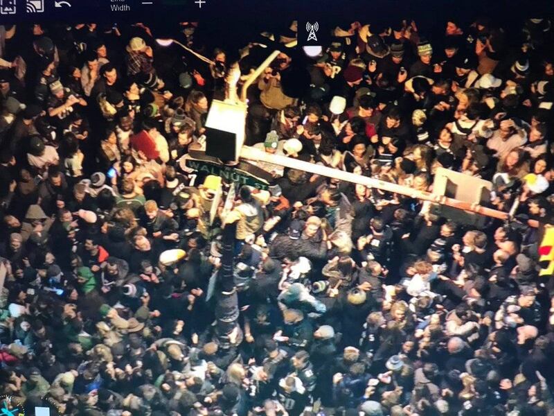 La lluvia y el granizo que cayeron sobre Filadelfia buena parte del día remitieron justo cuando, en toda la ciudad, la gente empezó a salir de bares de deportes, apartamentos y casas.