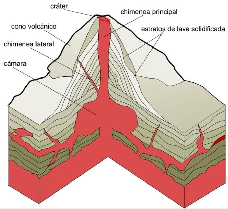 - Chimenea, la zona por donde suben los materiales desde el interior hasta el exterior de la Tierra. Una especie de tubo conductor.