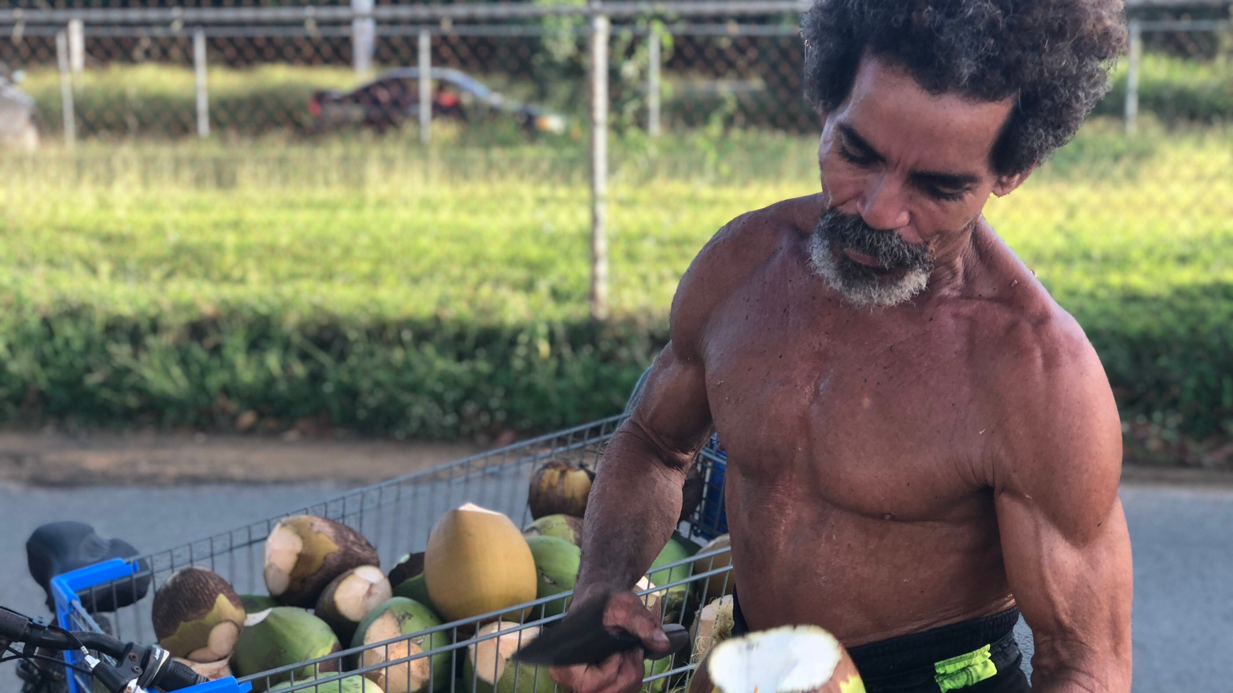 En Luquillo todo el mundo conoce a Carlos como el “Coquero Number One”. Es muy probable que lo veas en bicicleta de arriba a abajo por la “número 3” y arrastrando un carrito de compras lleno de cocos listos pa’ la venta o pa’ regalar.