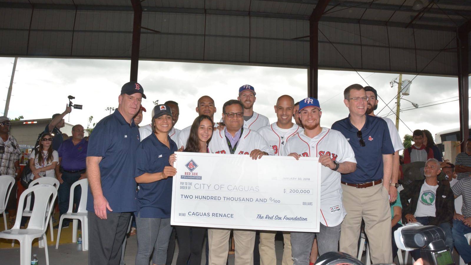 Tras explicar los motivos que trajeron a los Medias Rojas a Caguas, Kennedy le presentó al alcalde Willito Miranda Torres un cheque de $200 mil de parte de la organización de Boston. Según se explicó, la misma administración de la franquicia de béisbol será la que supervisará el uso de los fondos, los cuales se distribuirán entre las familias más necesitadas de Caguas.