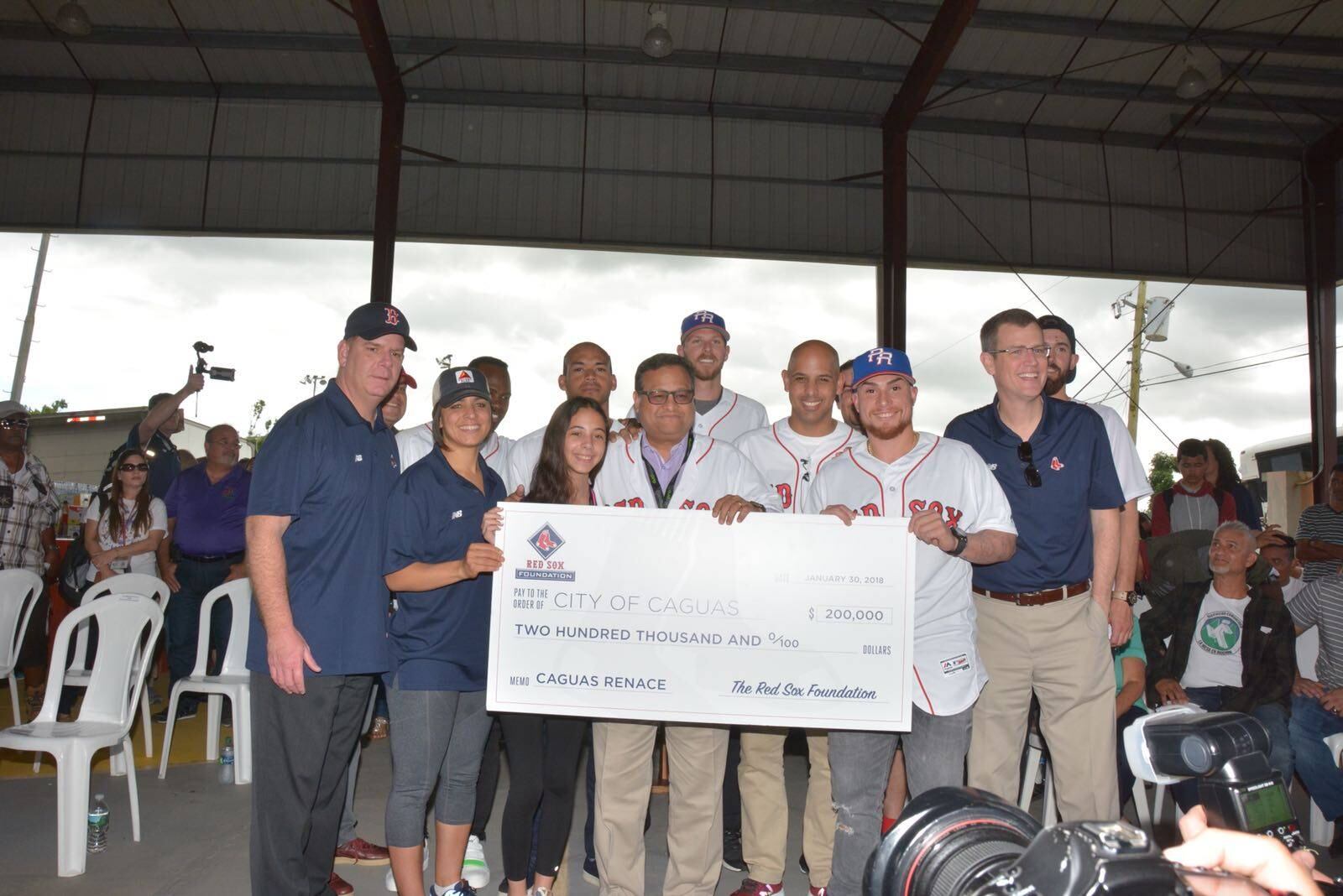 Tras explicar los motivos que trajeron a los Medias Rojas a Caguas, Kennedy le presentó al alcalde Willito Miranda Torres un cheque de $200 mil de parte de la organización de Boston. Según se explicó, la misma administración de la franquicia de béisbol será la que supervisará el uso de los fondos, los cuales se distribuirán entre las familias más necesitadas de Caguas.