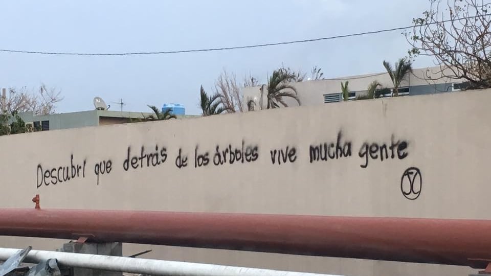 De camino al aeropuerto leo en una pared el siguiente mensaje: “Detrás de los árboles vive mucha gente”. Lo cogí de pasada, como esas cosas que te llaman la atención y rápido captas. Eran letras grandes, negras, legibles. Quien las pintó, sin duda, se tomó el tiempo necesario para que quedaran bien.