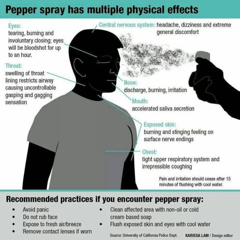 Si estás en una zona donde lanzan spray pimienta debes tener un pañuelo, gafas protectoras, una esponja y dos botellas plásticas: una con agua fresca y otra con Solución Seattle. Busca aire fresco y enjuágate con más Solución Seattle y agua. No te restriegues el área afectada.