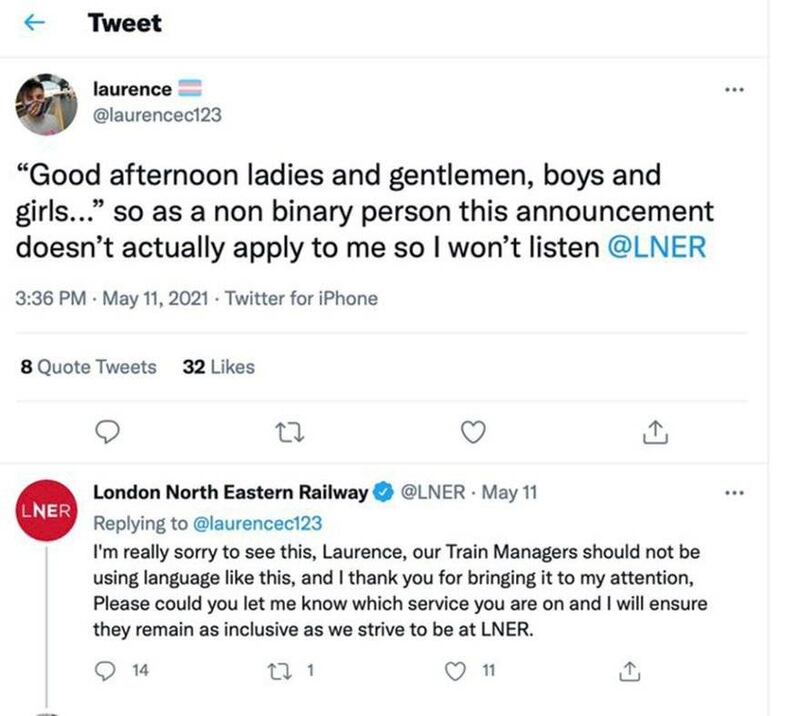 “Buenas tardes, damas y caballeros, niñas y niños”. Fue la frase que utilizó un conductor de tren de la empresa británica London North Eastern Railway, para dirigirse a sus pasajeros durante una ruta. Sin embargo, esto le causó una denuncia en redes sociales por parte de una persona no binaria por no usar lenguaje inclusivo en su saludo.