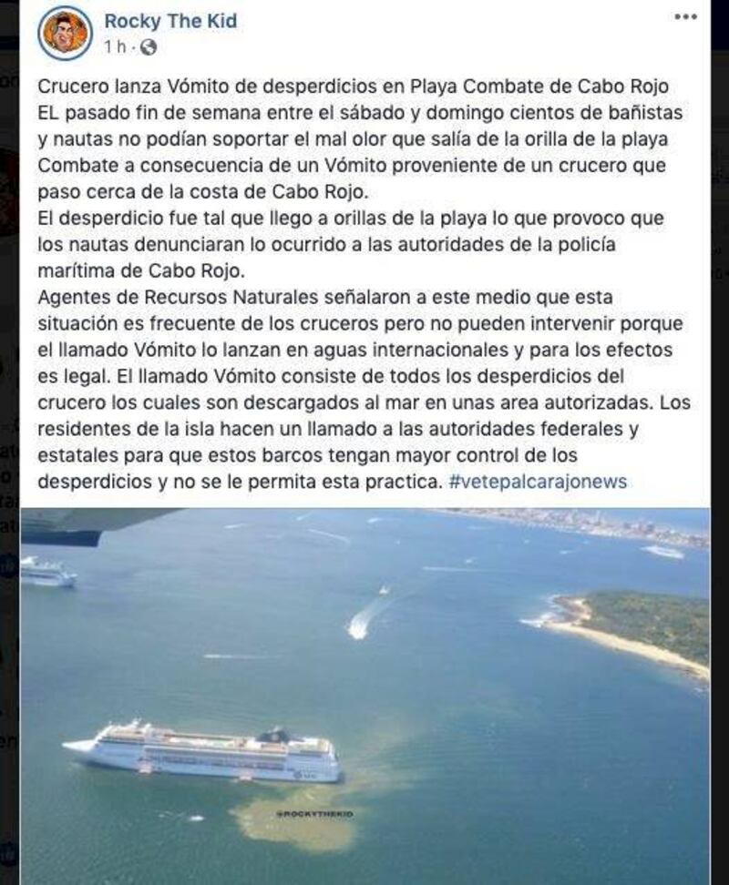 Lo que podemos afirmar es que hay mucha polémica en las redes, pues el GRAN PERIODISTA Rocky The Kid subió una foto de un crucero que, alegadamente, soltó porquerías al agua en Cabo Rojo.