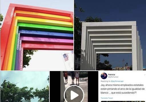 En las últimas horas se ha denunciado que “empleados estatales” pintaron de blanco el pórtico de la igualdad, homenaje a la lucha por los derechos de la comunidad LGBTTQ en Puerto Rico. Sin embargo, aún no se sabe, de manera oficial, si, en efecto, fueron funcionarios públicos los que llevaron a cabo esto.