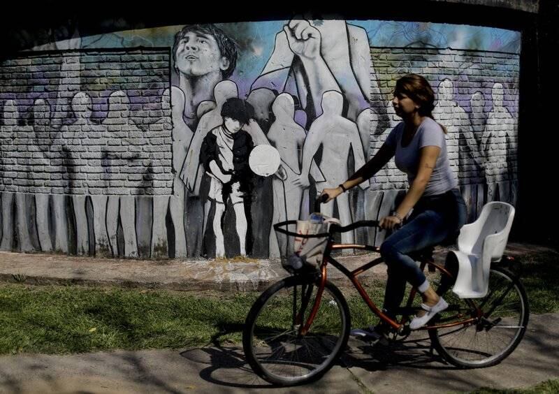Una mujer en bicicleta pasa por delante de la escuela primaria donde estudió Lionel Messi, la Escuela General Las Heras, en Rosario, Argentina. El mural con la imagen del futbolista fue pintado por alumnos y profesores del centro con la ayuda del artista local Rubén Pérez Barrios. (AP Foto/Natacha Pisarenko)
