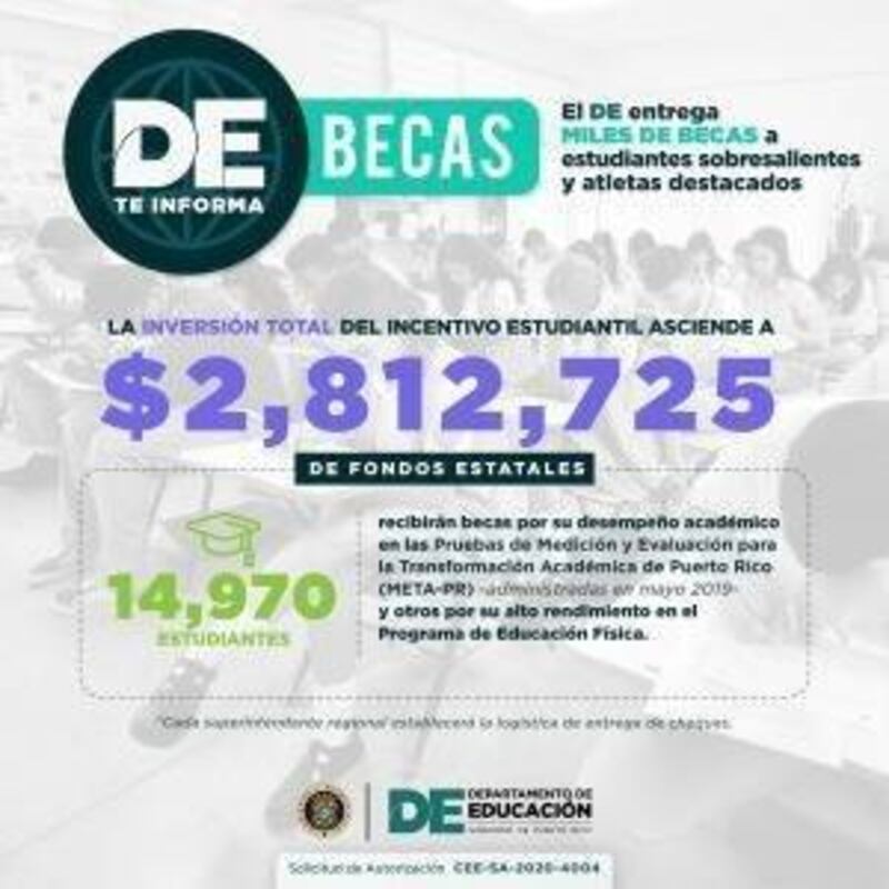 A partir de esta primera semana de mayo, 14,970 estudiantes del escuelas públicas recibirán becas por su desempeño académico en las Pruebas de Medición y Evaluación para la Transformación Académica de Puerto Rico (META-PR) -administradas en mayo 2019- y otros por su alto rendimiento en el Programa de Educación Física.
