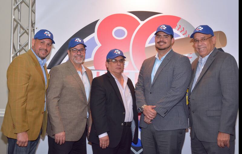 Yamil Benitez, Presidente Asociación de Peloteros Profesionales de PR; Pipo Molinari, Miembro Junta de Directores LBPRC y Delegado Alterno Indios de Mayagüez; CPA Raúl Rodríguez, Presidente Junta de Directores LBPRC; CPA Juan A. Flores Galarza, Nuevo Presidente LBPRC; Giovanni Hernández, Gerente Senior de Operaciones Internacionales MLB; Justo Moreno, Vicepresidente LBPRC y Carlos Berroa, Director de Torneo LBPRC.
