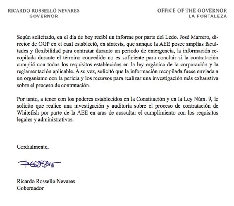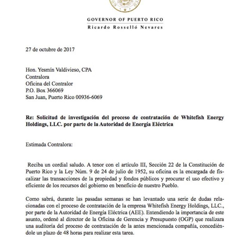El gobernador Ricardo Rosselló Nevares solicitó hoy a la Oficina del Contralor que realice una investigación y auditoría sobre el proceso de contratación de la compañía Whitefish por parte de la Autoridad de Energía Eléctrica (AEE).