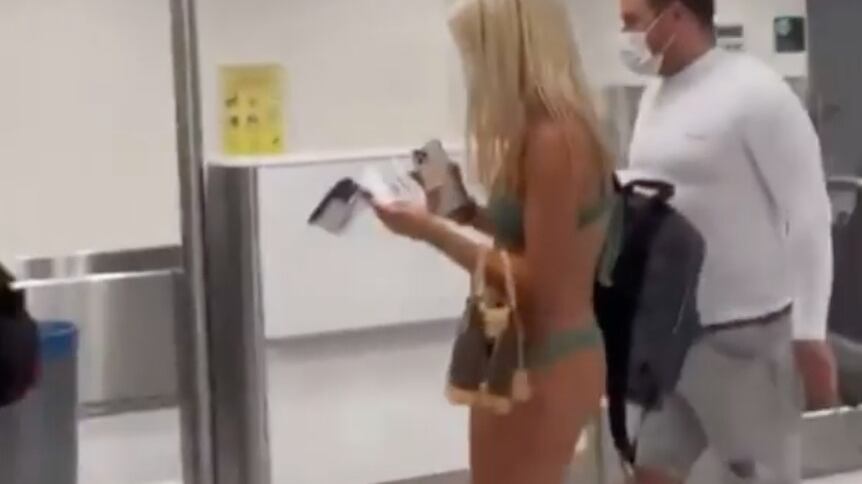 Se trata de un registro en que se ve a una mujer rubia que va con un bikini verde y camina por un aeropuerto como si nada.