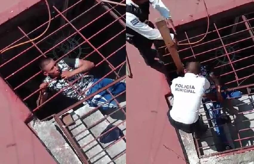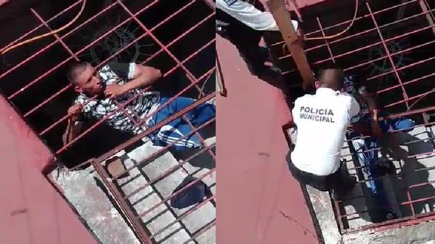 Instantes más tarde, dos elementos de la policía municipal de Morelia acudieron a la azotea del domicilio, de donde tomaron palos para forzar los barrotes y permitirle a implicado liberarse. No obstante, en los más de 10 minutos que duró la trasmisión, los uniformados no lograron sacarlo.