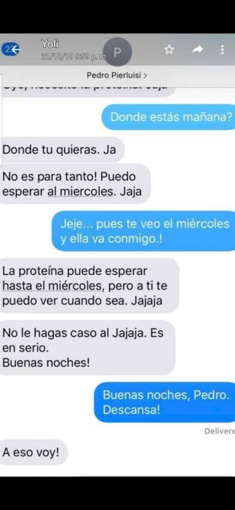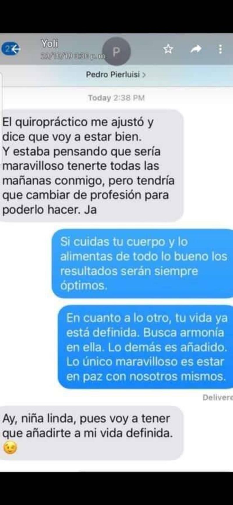Entonces, justo al borde del mediodía, estos mensajes de texto comenzaron a romper el internet. En los mismos, Pierluisi supuestamente le insistió hasta que de forma elegante ella intentó despacharlo diciéndole: “Tu vida ya está definida. Busca armonía con ella”.