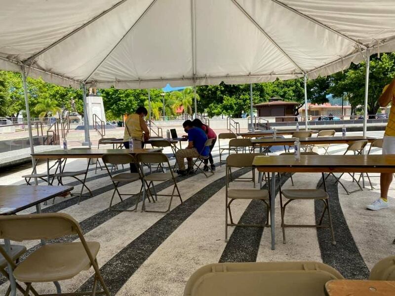 Se habilitaron carpas y mesas con silas en la plaza pública para que los estudiantes puedan conectarse a la red WiFi del municipio y tomar sus clases en línea, así como hacer sus tareas escolares.
