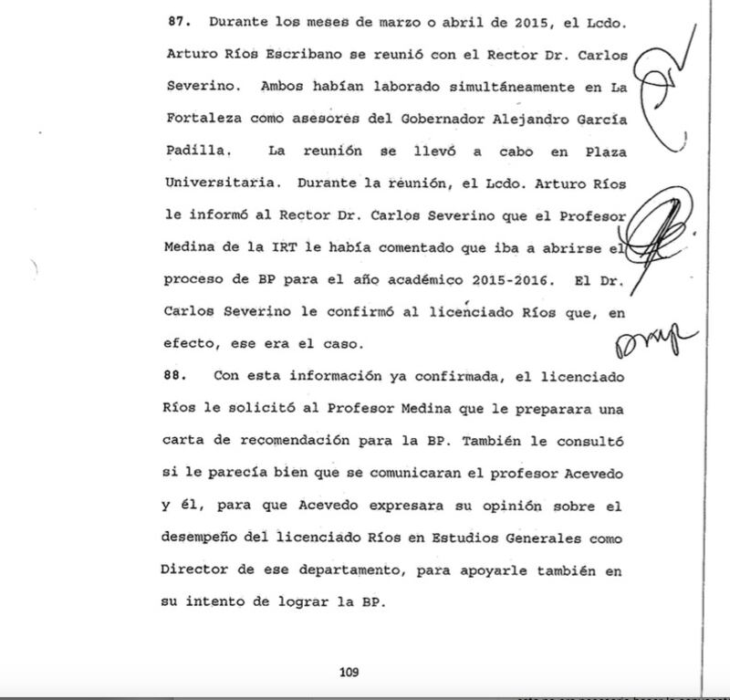 “La doctora (Palmira) Ríos se sinceró y admitió que se habían recibido presiones a favor de Carlos Pagán y Arturo Ríos y que éstos no obtendrían plazas si competían por las plazas”, detalla el informe sobre la recomendación que hiciera el Instituto de Relaciones del Trabajo, sin seguir las reglamentaciones sobre personal, para tratar de garantizarle una plaza a Ríos, uno de los requisitos de la exclusiva Beca.