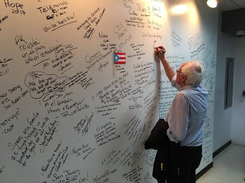 Pasó el mayor tiempo con la alcaldesa de San Juan, Carmen Yulín Cruz, aunque también intercambió expresiones con el gobernador Pedro Rosselló, quien se identifica con el Partido Demócrata en el que durante años militó Sanders. Temprano durante la semana, Sanders le confirmó a un reportero de Fox News que seguiría su carrera política como independiente.