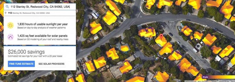 Google presenta un nuevo servicio en línea que rápidamente analiza la adopción de un sistema de energía solar y si los propietarios de una vivienda deberían considerar comprar o rentar paneles fotovoltaicos que cuestan miles de dólares. Project Sunroof de Google combina imágenes celestes de Google Earth con cálculos sobre cuánta sombra arrojan árboles sobre un techo, con datos de patrones de clima locales, precios de la industria y subsidios disponibles.