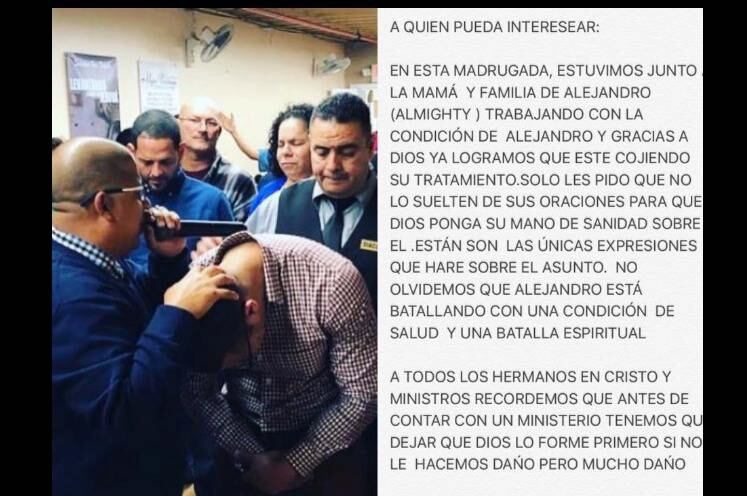 En un mensaje repleto de errores ortográficos, el pastor del combo de setenta resaltó que Alejandro Mosqueda, nombre terrenal del ente de luz apodado Almighty, “está batallando con una condición de salud y una batalla espiritual”. Dijo además que se mantiene en comunicación con la madre de este siervo.