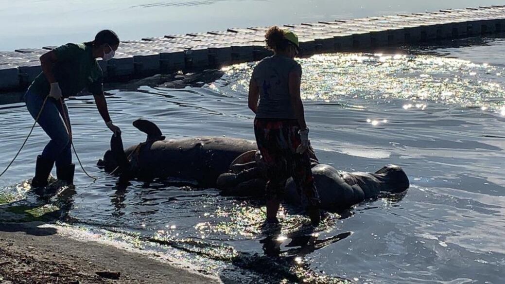 A pesar de que ese morón se fue a la fuga, el animalito quedó varado y moribundo en plena costa.