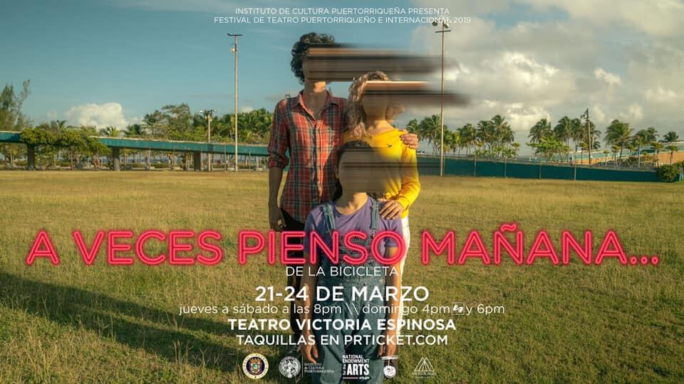 A veces pienso mañana… se estará presentando en el Teatro Victoria Espinosa del 21 al 24 de marzo de 2019 (jueves, viernes, sábado 8pm y el domingo a las 4pm y 6pm). La función del domingo a las 4pm contará con intérpretes de lenguaje señas. La dirección está a cargo de Heriberto Feliciano Rodríguez, el diseño de iluminación por Israel Franco-Müller, la realización de la escenografía por José Luis Gutiérrez y música original por Gabriel Rivera Vásquez. Agradecemos al Instituto de Cultura Puertorriqueña, al National Endowment for the Arts, a Mezcolanza, inc. ¡Les Esperamos!